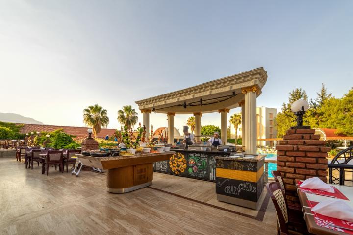 U ponudi su glavni restoran s buffet doručkom, ručkom i večerom, kao i snack barovi uz bazene i plažu. Piće uključuje lokalna alkoholna i bezalkoholna pića, dok su premium opcije i svježe cijeđeni sokovi dostupni uz mogućnost doplate. Gosti dobivaju pisane informacije o svim uključenim opcijama.