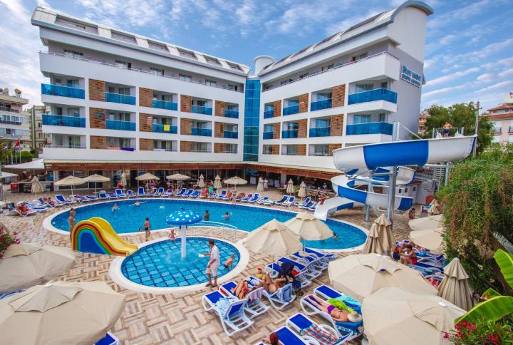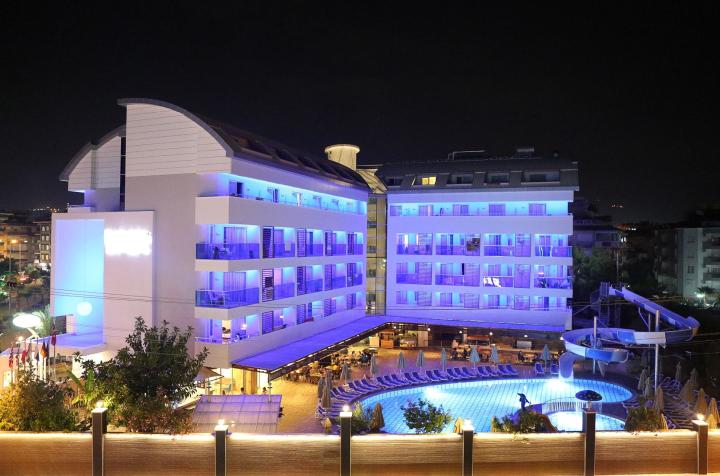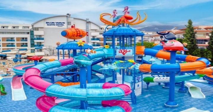 Blue Wave Suite Hotel je obiteljski orijentirani hotel s 4 zvjezdice smješten u Alanyinom naselju Oba, na 11 hektara uređenog vrta i svega 2 km od centra grada i 125 km od zračne luke Antalya. Resort ima ukupno 223 sobe raspoređene u glavnoj i pomoću zgrada, te se izdvaja vodeni park, dječji sadržaji i živahna animacija.