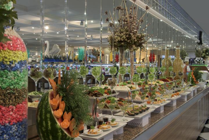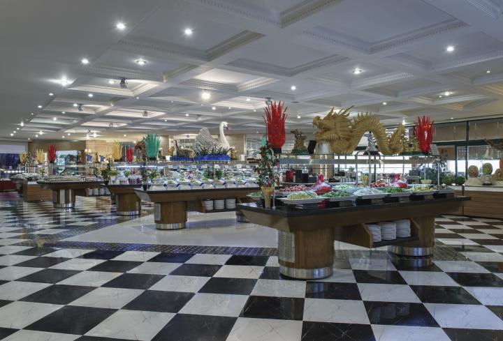 Glavni buffet restoran nudi doručak, ručak i večeru. Dostupno je sedam à la carte restorana (različitih svjetskih kuhinja), uz obaveznu rezervaciju i besplatan posjet u skladu s paketom. Barovi uključuju lobby bar, plažu, pool bar, disco bar, vitamin bar i druge. Pisane informacije o sadržajima dostupne su gostima pri dolasku.
